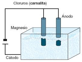 1.- Por electrólisis (carnalita): se obtiene por electrólisis de MgCl2 fundido con CaCl2 y NaCl a una temperatura de 700-720ºC. Cuando comienza la electrólisis el Mg se separa del Cl y asciende a la superficie (ya que su densidad es menor). El recipiente debe de ser metálico ya que actúa como cátodo.